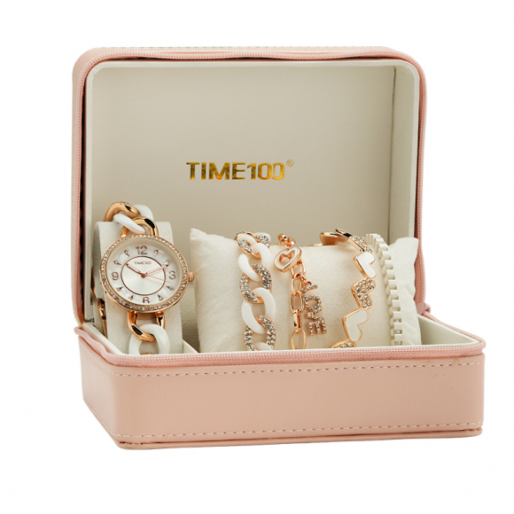 时光一百(TIME100)女表小表盘简约防水女士腕表套装女手链手表七夕礼物送女友W50888L钢色